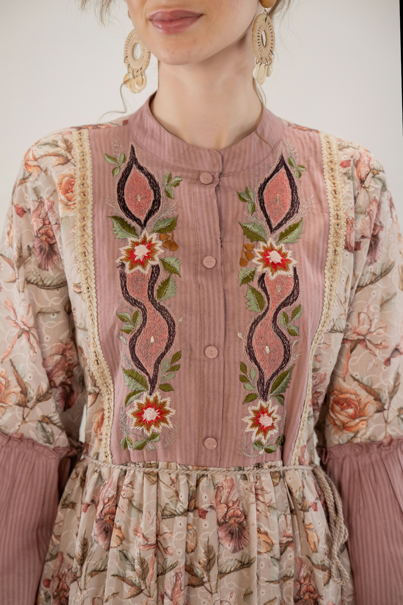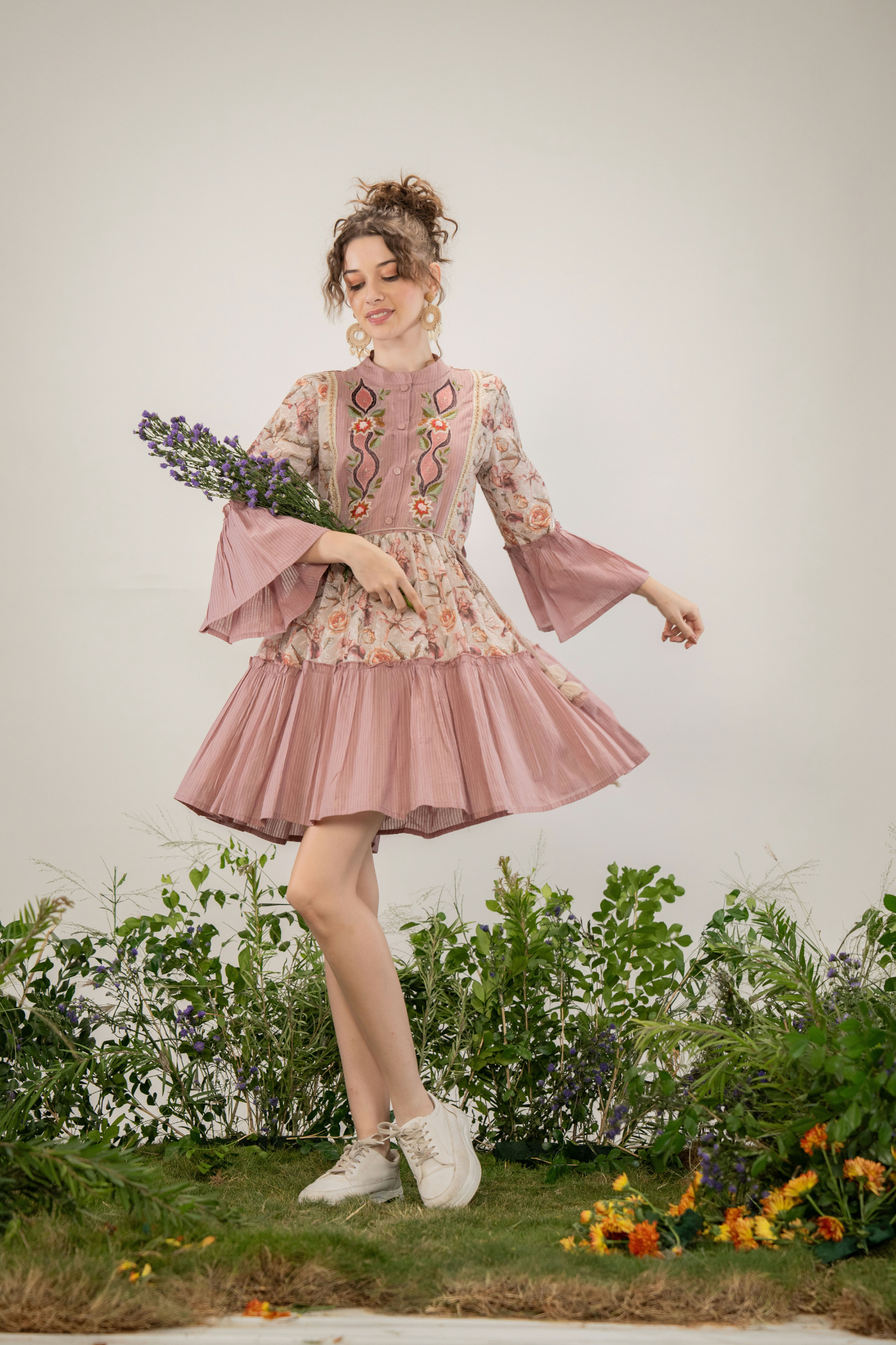 Step into a garden of elegance with the Dusky Rose Whirl Embroidered Cotton Dress. Crafted from soft, breathable cotton and adorned with intricate floral embroidery, this dress is the perfect blend of charm and grace. The flared hem and bell sleeves add a touch of playful movement, while the dusty rose hue whispers effortless sophistication. Whether you're brunching or twirling through your day, this piece promises to be your go-to story in style