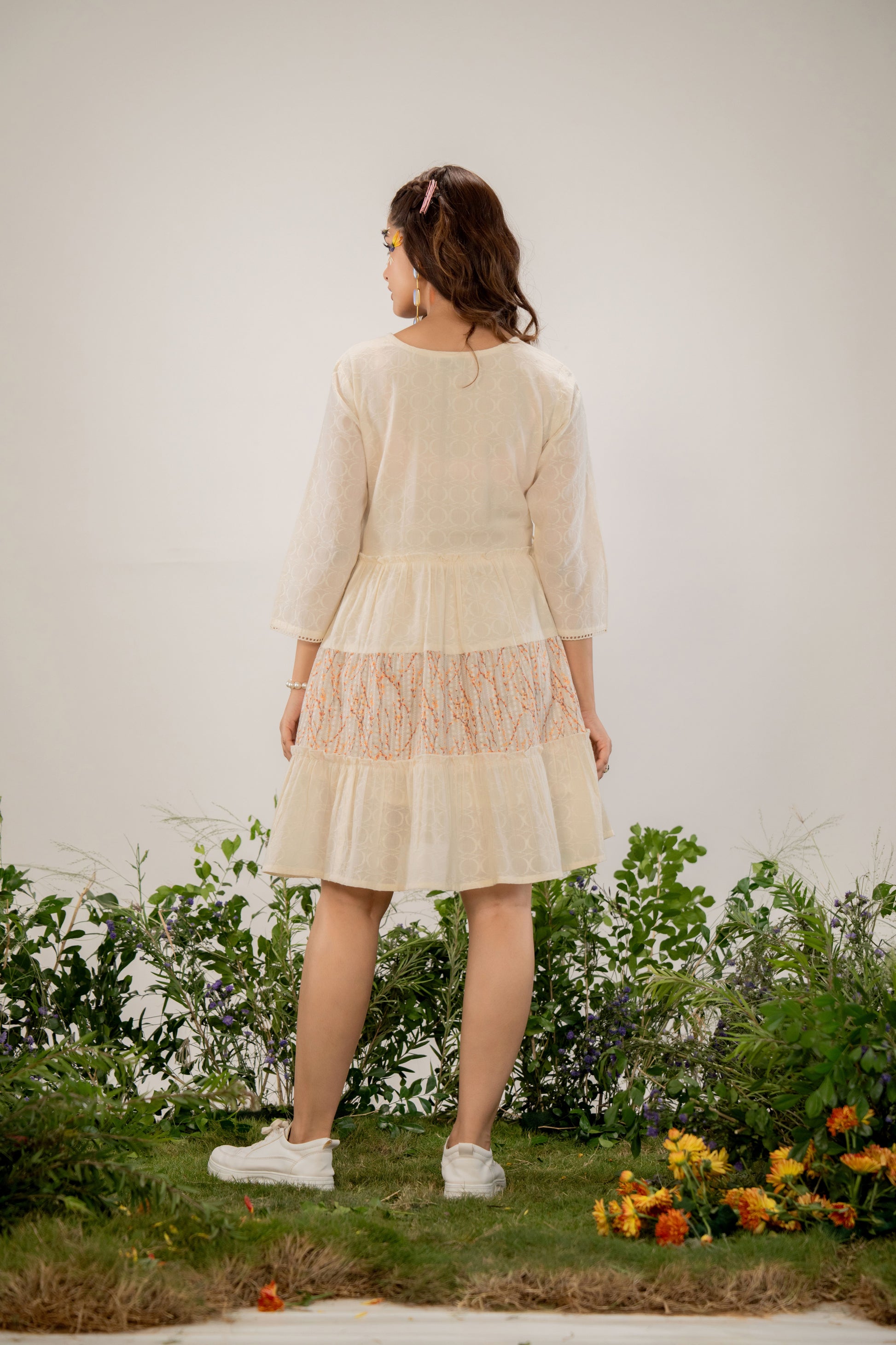 Ivory Meadow Embroidered Pure Cotton Short Dress is made from breathable, skin-friendly pure cotton, offering all-day comfort with timeless elegance. Featuring delicate floral embroidery, a flattering A-line silhouette, and soft ivory tones, this dress is perfect for casual outings, brunch dates, and relaxed day wear. Lightweight and airy, it blends graceful craftsmanship with modern style, making it an effortless choice for warm-weather dressing.