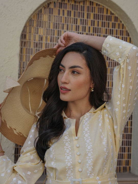Introducing the Marigold Whisper Cotton Embroidered Short Dress, a soft, sunshine-kissed expression of effortless femininity. Crafted from lightweight, breathable cotton, it features delicate white embroidery, a flattering belted waist, and graceful flared sleeves that move beautifully with every step. The gentle pastel yellow hue radiates warmth and joy, making it perfect for picnics, brunches, holidays, or everyday elegance. Pair with sandals or heels for a fresh, timeless, and confidently charming NIVARA look.