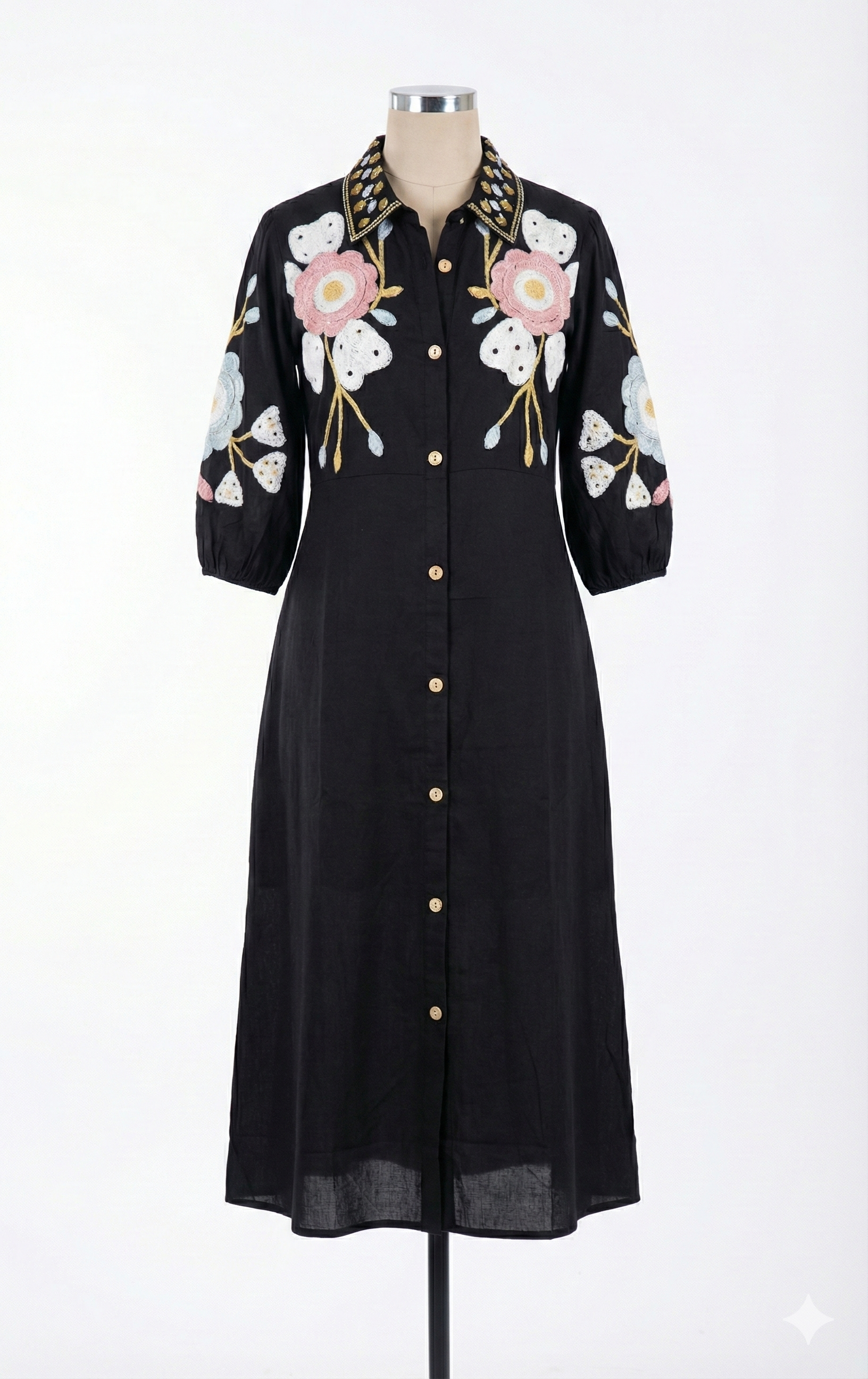 Elevate your everyday elegance with this black embroidered cotton midi dress, crafted for effortless comfort and timeless style. Featuring delicate floral embroidery, a flattering A-line silhouette, and breathable cotton fabric, this dress is perfect for casual outings, brunch dates, or summer evenings. The button-down front and three-quarter sleeves add a refined touch, making it a versatile wardrobe essential for women who love understated sophistication and handcrafted details.